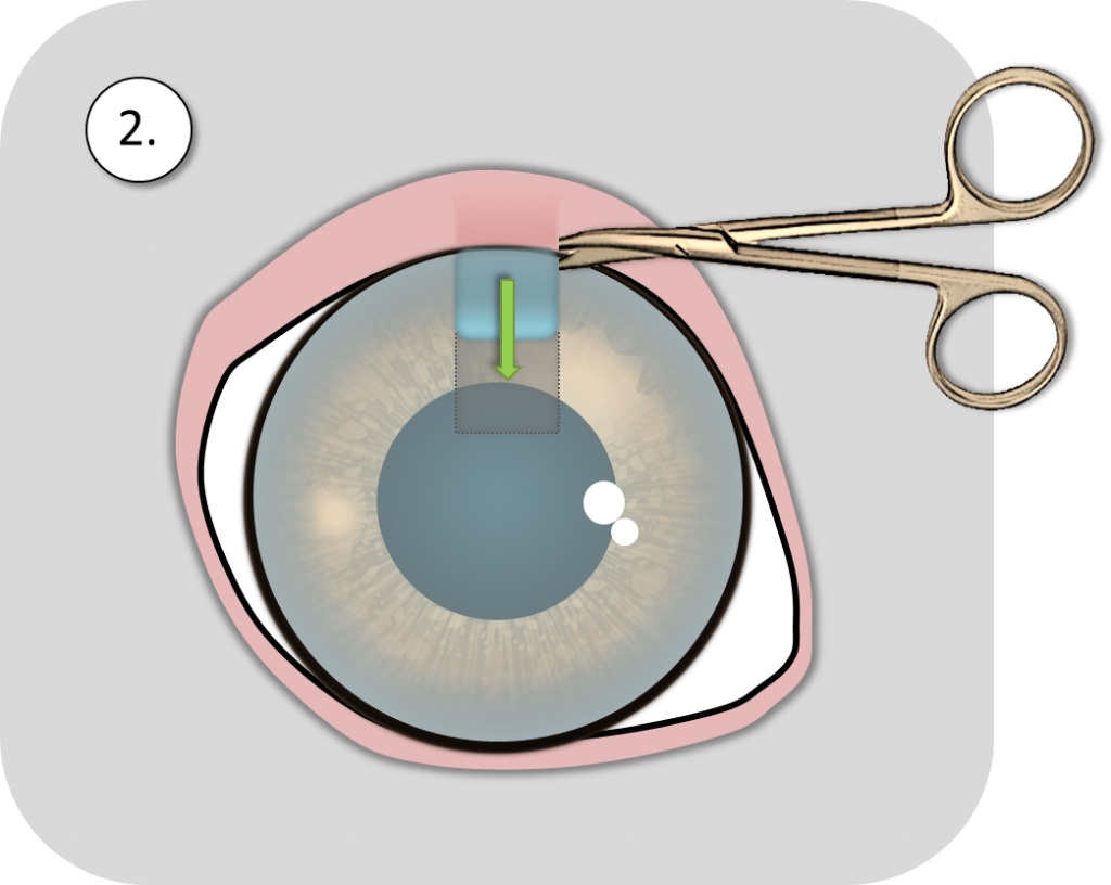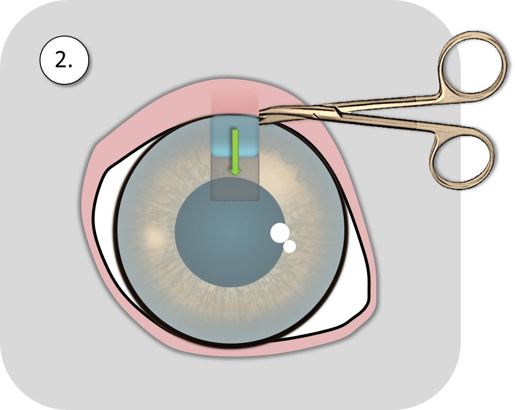 Die angrenzende gesunde Hornhaut und Bindehaut werden als verschiebbarer Lappen präpariert und in den Defektbereich verschoben.
