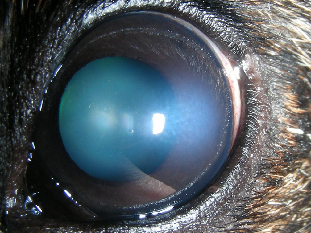 Die 12jährige Rauhaardackelhündin Franzi leidet unter einer Erkrankung der Hornhaut, der sogenannten Endotheldystrophie. Diese Krankheit geht mit einer zunehmenden Eintrübung der Hornhaut einher. Die Ursache hierfür ist eine Wassereinlagerung (Ödem) in die Hornhaut. Diese Veränderung tritt in der Regel bei älteren Hunden auf und führt mit der Zeit zu Sehproblemen. Später kommen sogar Blasen (Bullae) in der Hornhaut hinzu, die sehr schmerzhaft sind, wenn sie aufplatzen.
