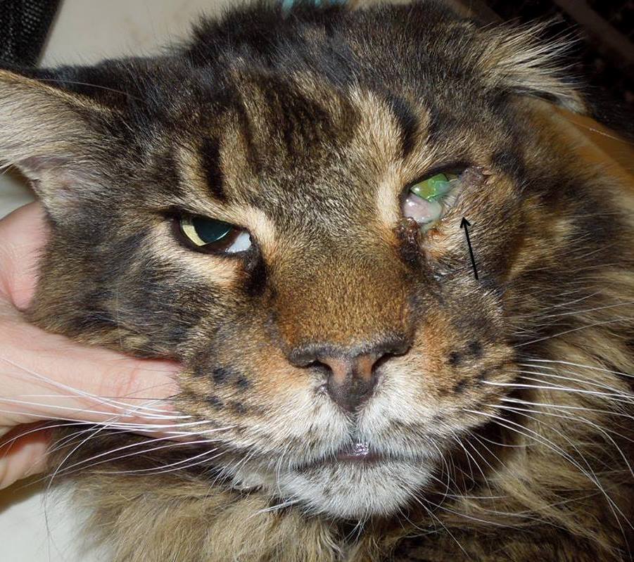 Katze mit Unterlidentropium links. Typisch ist die dreieckige Augenform.
