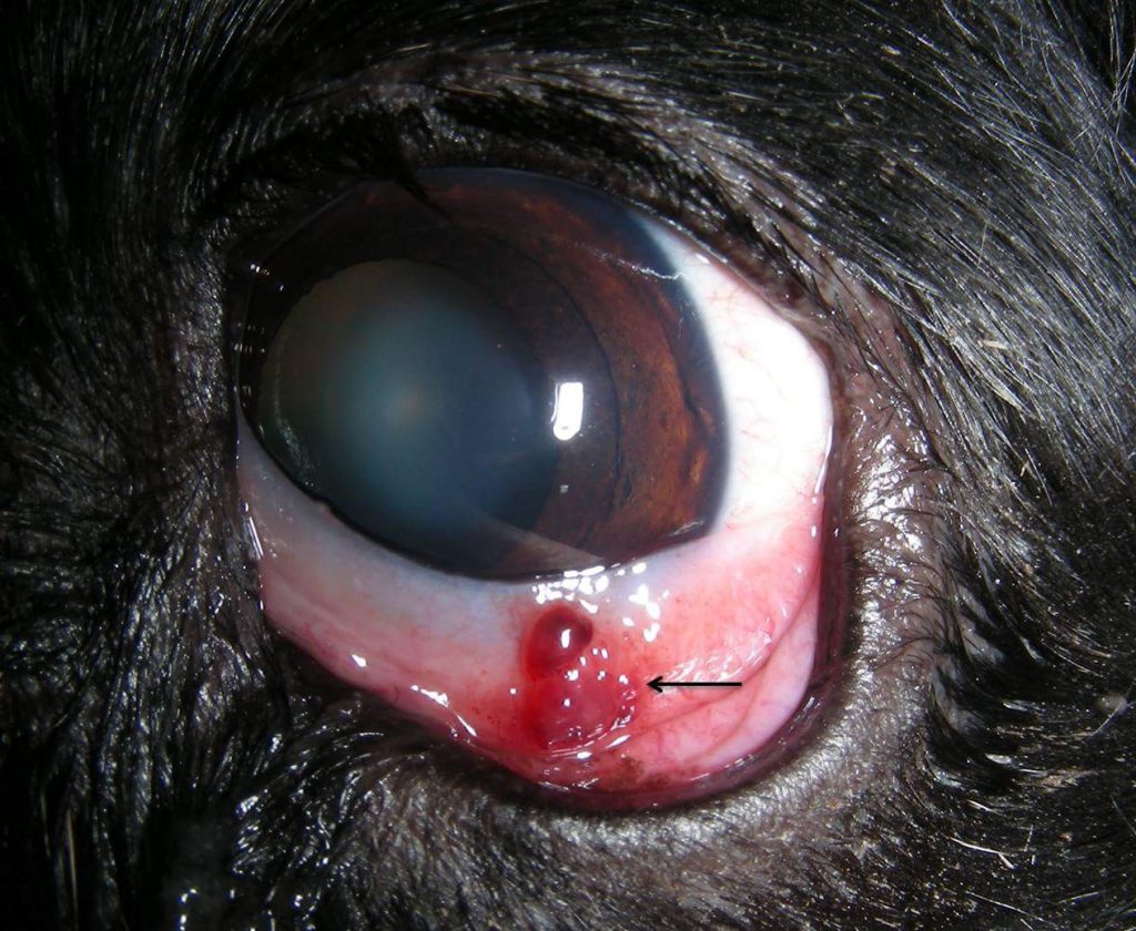 Außenseite der Nickhaut eines Hundes mit bösartigem Blutgefäßtumor (Hämangiosarkom)