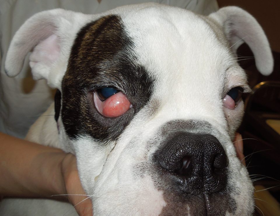Cherry eye beidseits. Die große Drüse behindert den Lidschluss immens und stört das Sehvermögen.