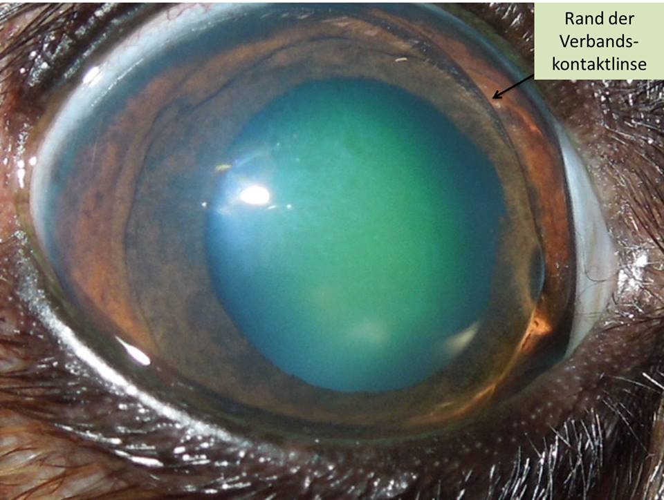 Hund nach Abrasio corneae und mit Verbandskontaktlinse