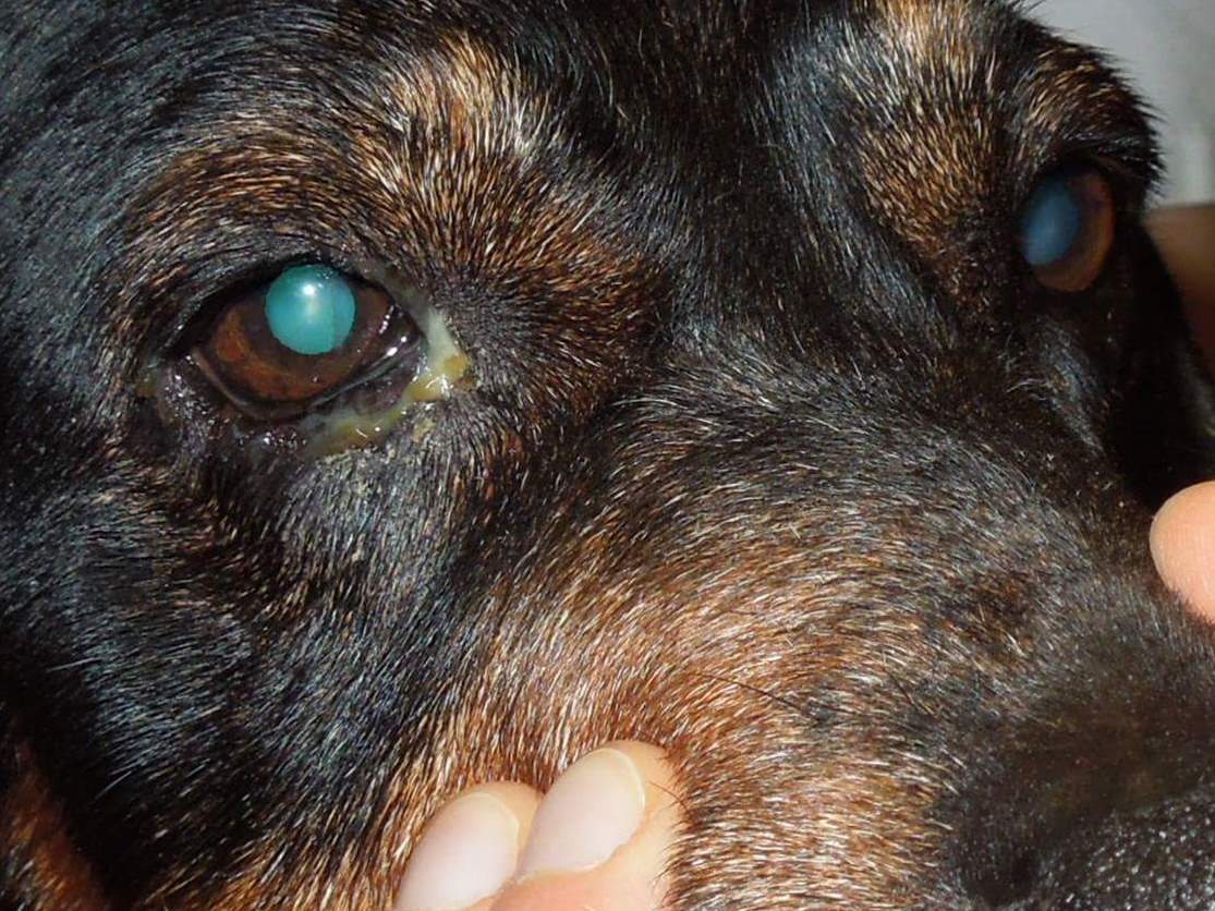 Typisches klinisches Bild bei einem Fremdkörper in den Tränenwegen: eitriger Augenausfluss trotz Therapie.