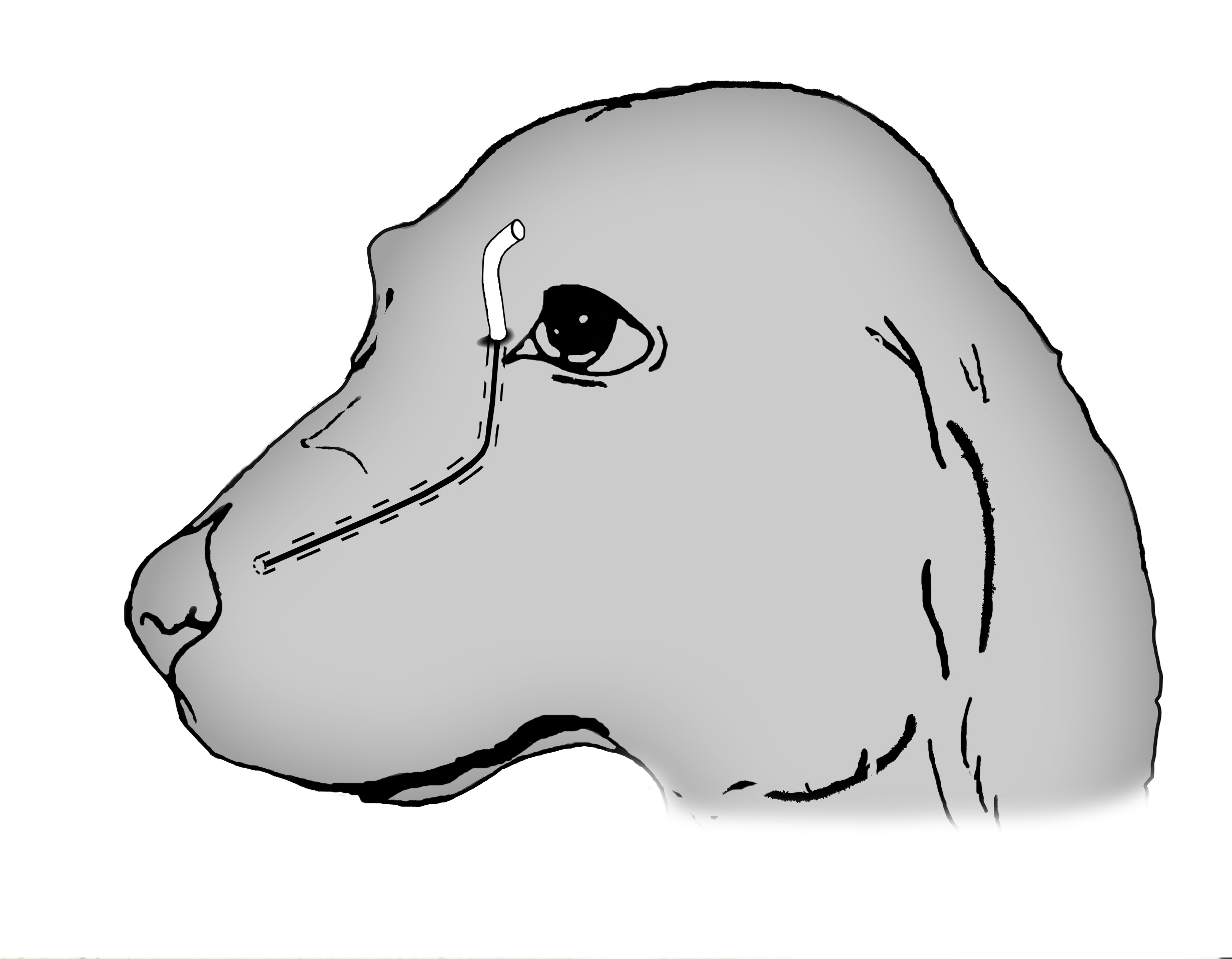 Katheter im Tränennasengang. Das Ende des Katheters wird an der Haut des nasalen Augenwinkels mit Nähten befestigt.