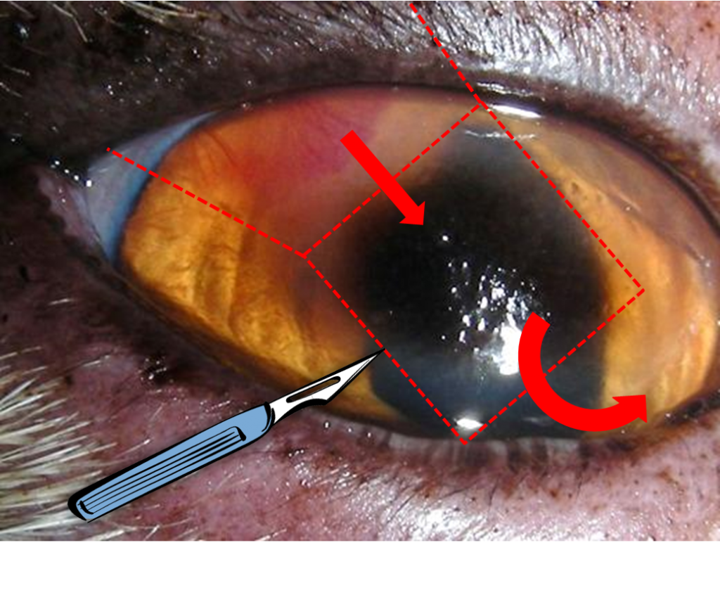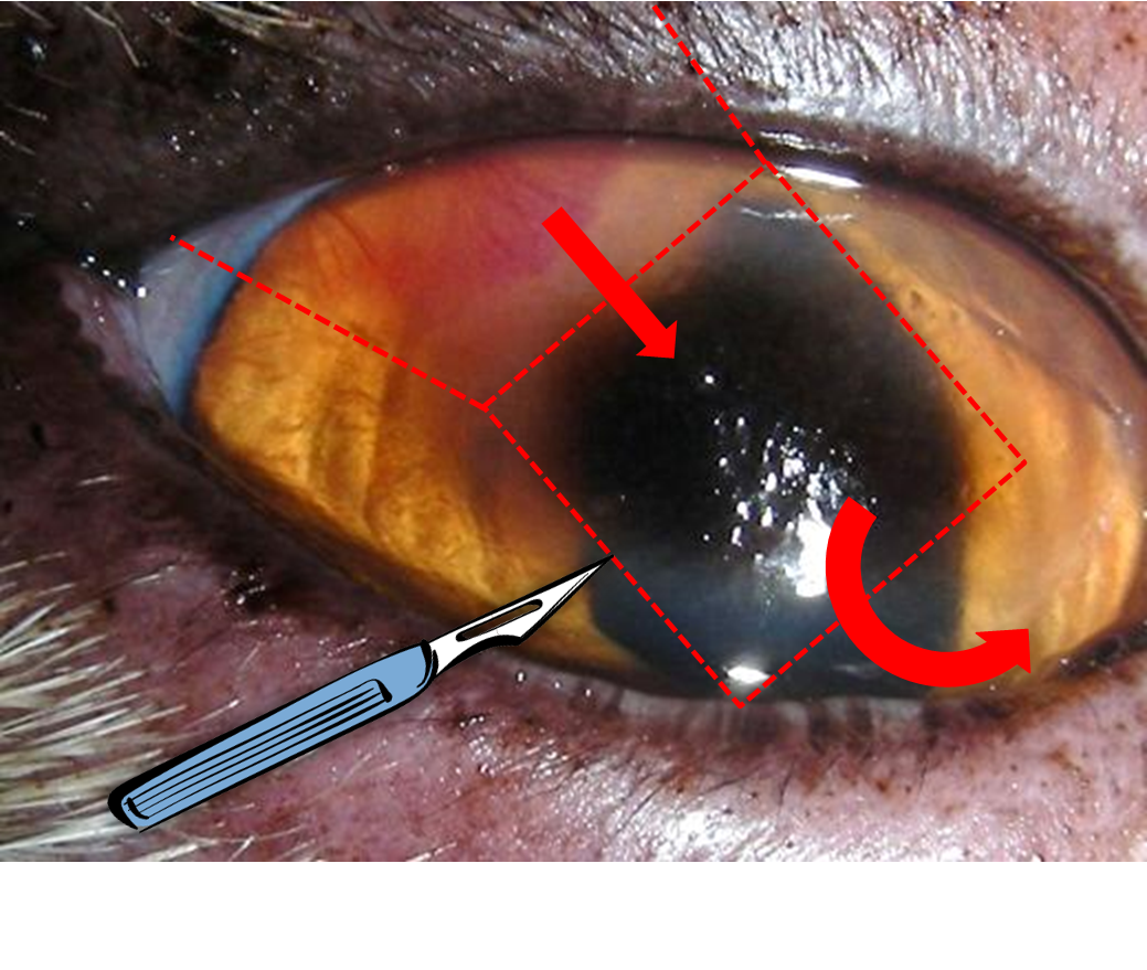 OP-Planung bei CCT: eckige Entfernung des Sequesters, Verschiebung der gesunden, benachbarten Hornhaut in den Defektbereich