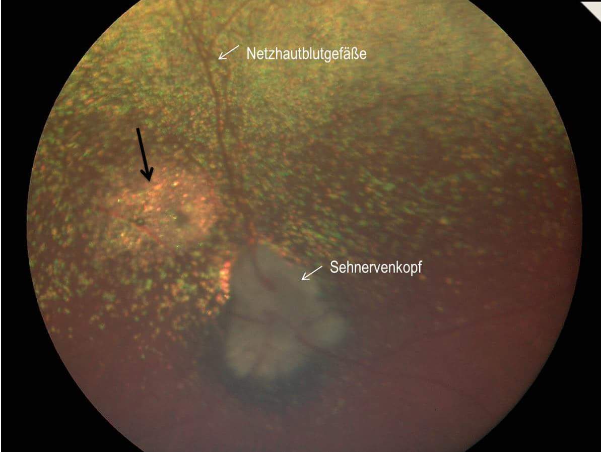 Netzhaut mit Narbe (Pfeil).