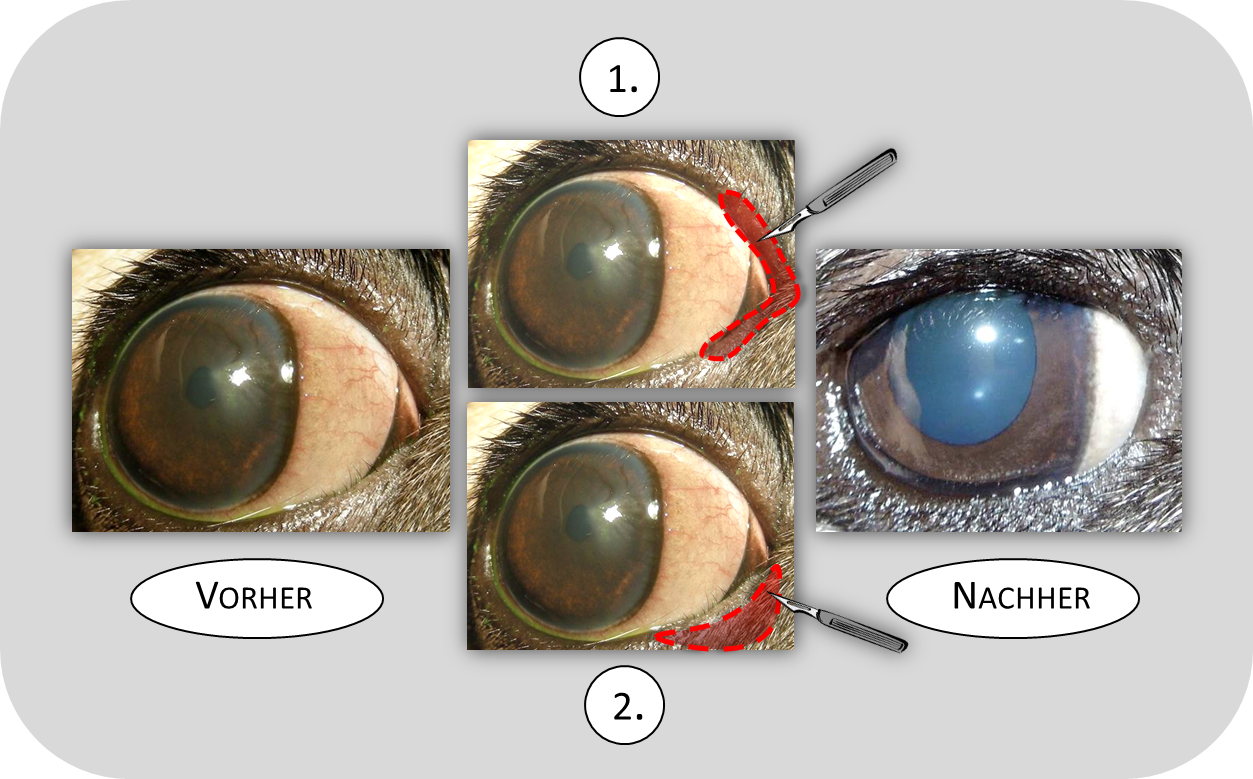OP Nasale Kanthusplastik. 1. Nasal wird das Lid gekürzt, 2. Entropiumkorrektur (Korrektur der Lideinrollung)