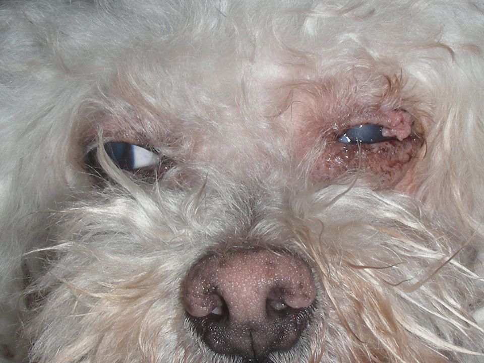 Ältere Hunde entwickeln sehr häufig Tumore an den Augenlidern. Oft handelt es sich um gutartige Tumore ausgehend von den Lidranddrüsen (Meibom’sche Drüsen). Aber auch bösartige Tumoren können vorkommen. Junge Hunde können ebenfalls, wenn auch deutlich seltener, betroffen sein. Da sich die Tumore meist direkt am Lidrand befinden, gleiten sie bei jedem Lidschlag Ihres Tieres über die Hornhaut. Dies verursacht zum einen ein unangenehmes Reibegefühl, zum anderen kann die Hornhaut geschädigt werden. Deshalb sollten Lidrandtumore chirurgisch entfernt werden.