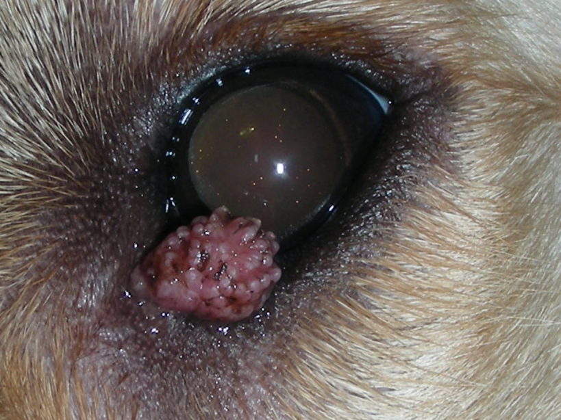 Die 12 Monate alte Golden Retriever-Hündin Jule hat eine schnell wachsende Zubildung am Unterlid. Das blumenkohlartige Erscheinungsbild ist typisch für sogenannte Papillome, also warzenartige Tumore. Papillome kommen bei jungen Hunden generell häufig vor und sind nicht selten virusbedingt. Sie können sich von allein zurückbilden. Abwarten ist aber bei Papillomen am Lidrand nicht empfehlenswert, da sie, wie in Jules Fall, schnell wachsen können.
