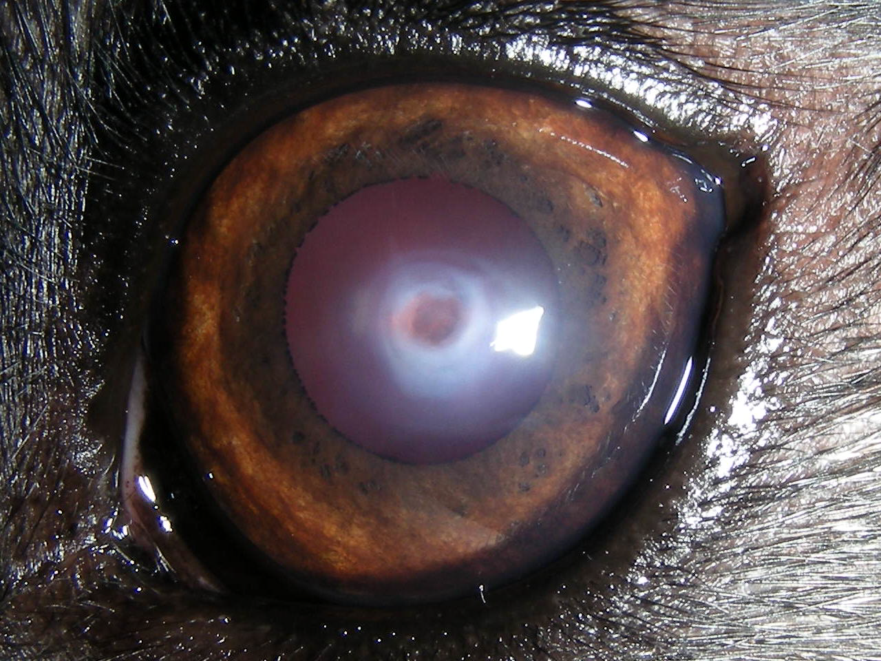 Descemetocele. Der tiefe Defekt ist von einem weißlichen Ring umgeben, einer Hornhautverdichtung, die eine weitere Abheilung verhindert.