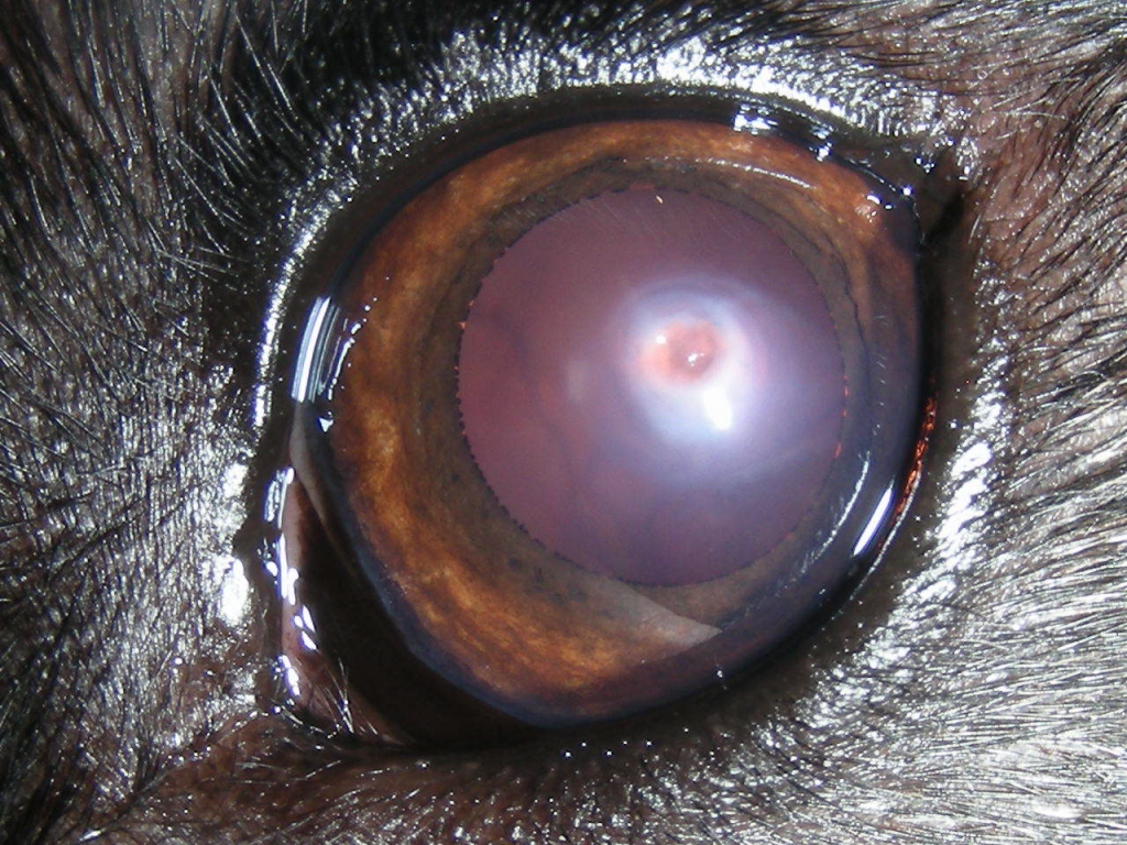 Das Zentrum der Descemetocele wölbt sich durch den Augeninnendruck etwas vor.